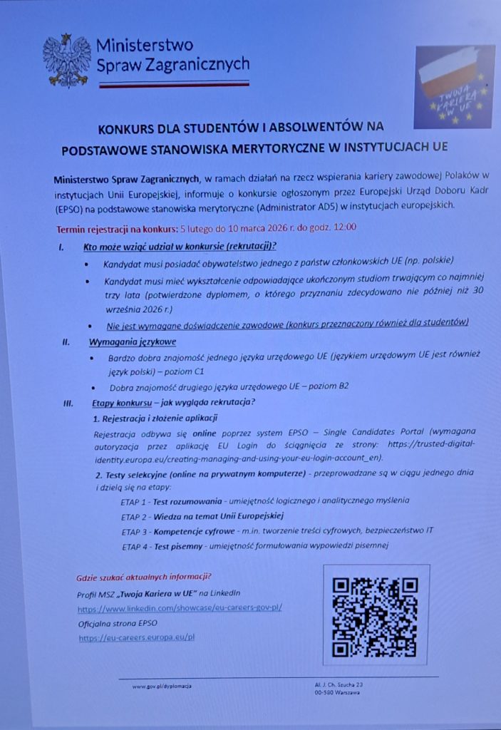 KONKURS DLA STUDENTÓW I ABSOLWENTÓW NA PODSTAWOWE STANOWISKA MERYTORYCZNE W INSTYTUCJACH UE